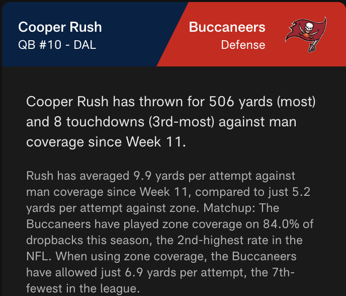 Similar to the Buccaneers' issue on defense, the Cowboys have rotated multiple CBs throughout the season. The Cowboys have had 7 different cornerbacks play over 150 snaps this season, the most by any team in the NFL. With Trevon Diggs out with a knee injury, the Cowboys don't have a player who could realistically be expected to cover Evans in man coverage. And with their struggle to maintain discipline after a few successful plays by the offense, there's a high probability of Baker Mayfield having some opportunities to Evans down the field. The Cowboys have only given up deep pass plays (20+ yards in the air) ten times this season. However, they’ve allowed three of those catches to go for 50+ yards, including two that went for over 80.